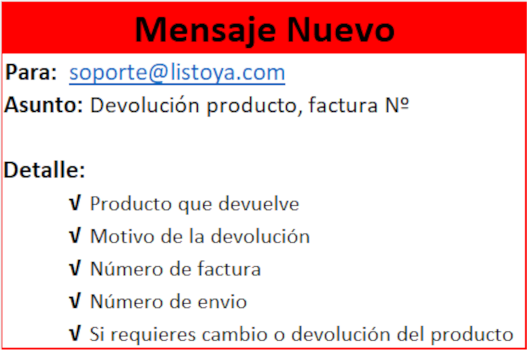 Si deseas realizar cambio de producto o devolución de dinero, necesitaremos que nos envíes tu producto a nuestra casa matriz.